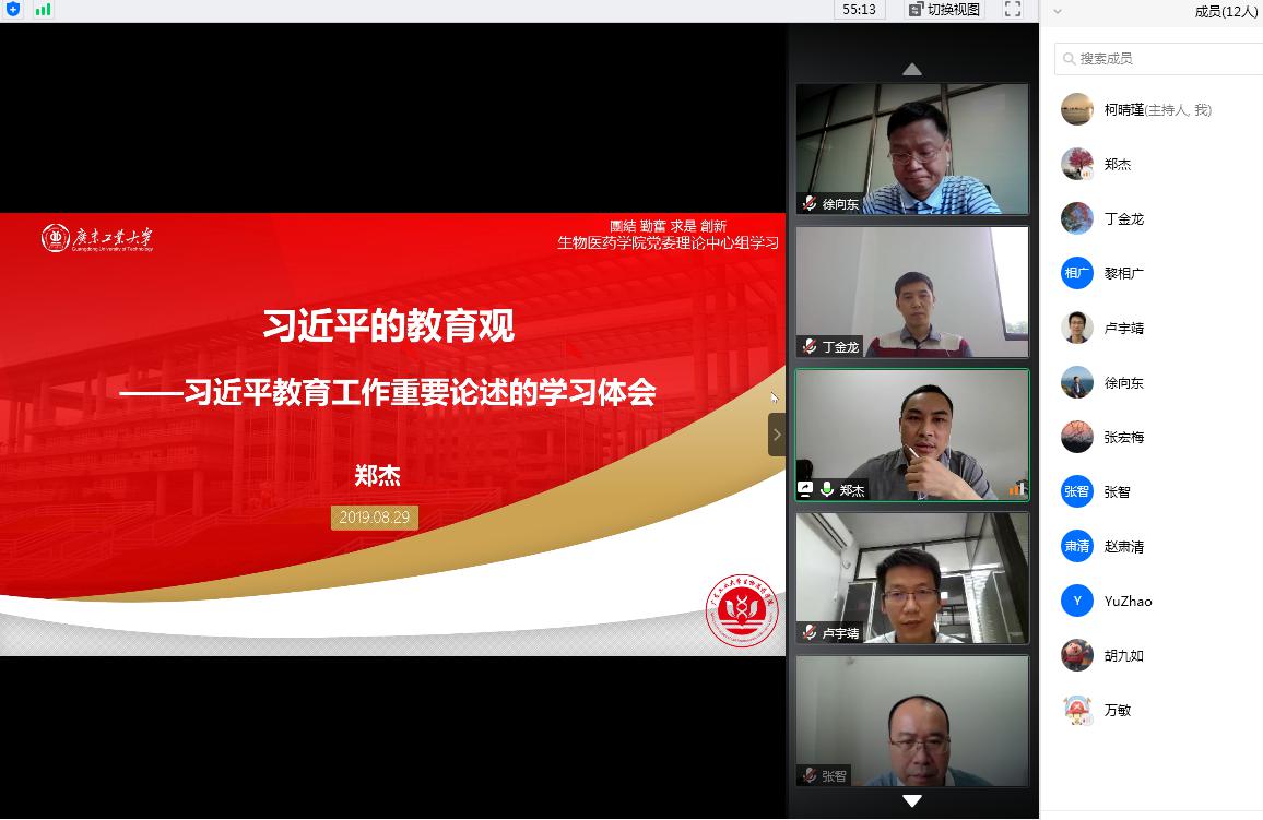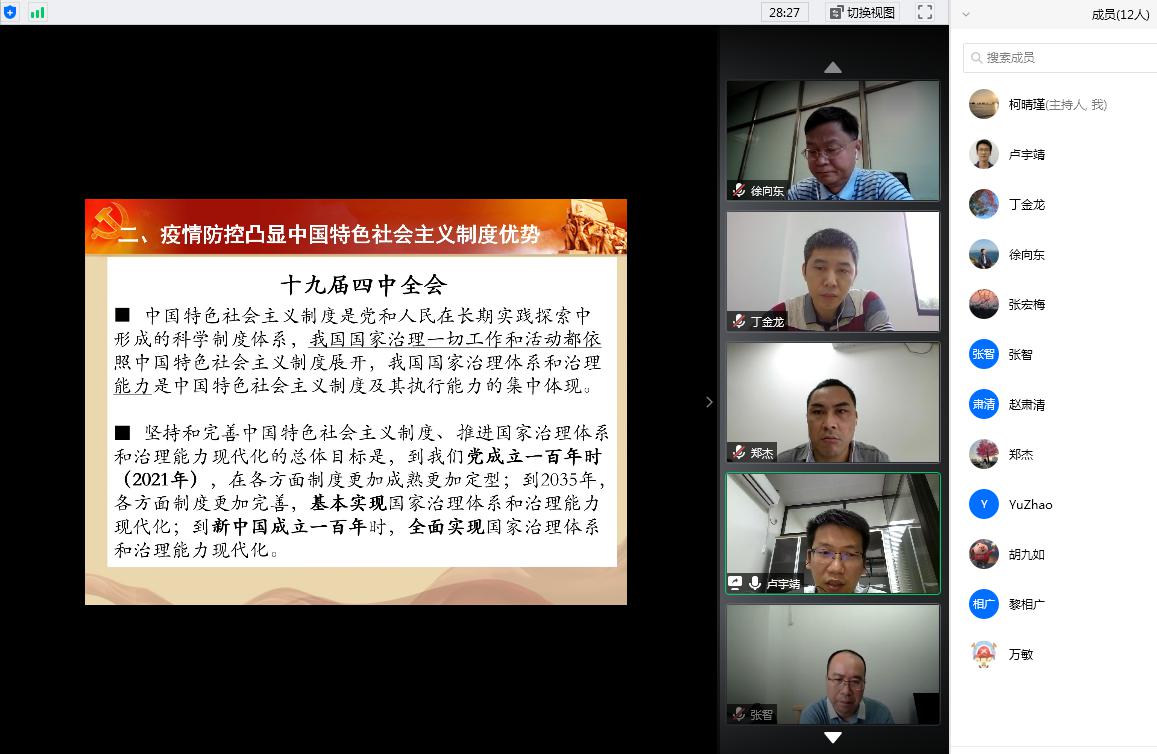 6月2日上午,看足球的网站 党委理论学习中心组开展线上集体学习活动,深入学习领会习近平总书记关于坚持和完善中国特色社会主义制度、推进国家治理体系和治理能力现代化的重要论述及习近平总书记关于教育的重要论述,理论学习中心组成员参加了学习。本次专题学习分别由学院副院长卢宇靖、郑杰主讲。 卢宇靖以全民战“疫”与中国特色社会主义制度自信为主题,与大家回顾了新冠肺炎疫情发生到疫情防控过程,学习了十九届四中全会《中共中央关于坚持和完善中国特色社会主义制度、推进国家治理体系和治理能力现代化若干重大问题的决定》,举例比较了中国特色社会主义制度与西方一些国家的制度模式的不同,他认为我国对新冠疫情的防控工作彰显了中国特色社会主义制度优势,展现了良好的治理效能。 郑杰结自己学习习近平关于教育工作重要论述的学习体会,围绕教育的地位和作用、根本任务,如何推进教育改革,实现教育公平等方面进行学习分享。结合看足球的网站 本科教学工作现状,他认为要立足学校服务湾区发展目标,探索医工结合人才培养模式,最终实现立德树人根本任务。