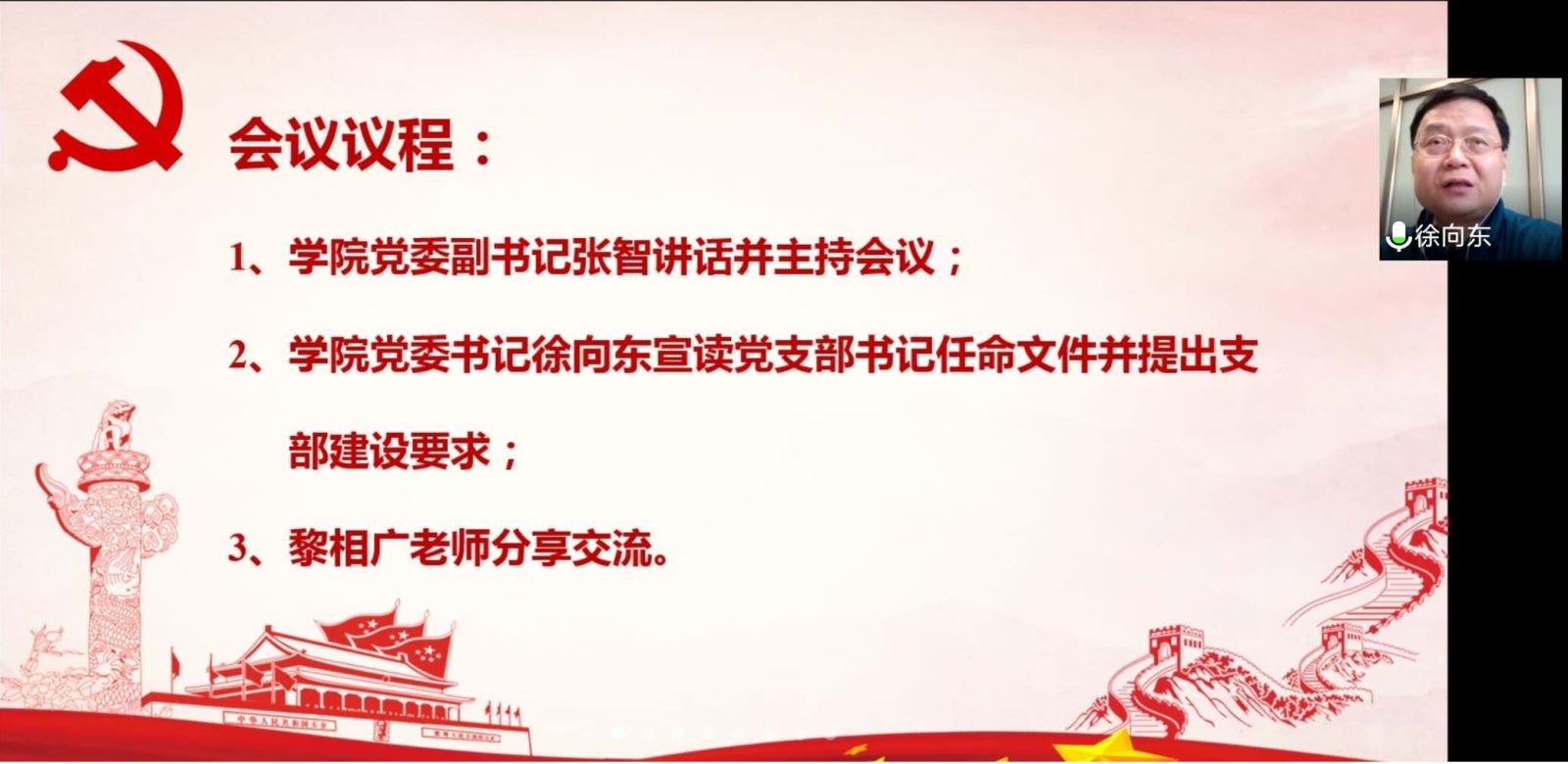 4月22日下午,看足球的网站 学生第四党支部线上召开了第一次支部大会。学院党委书记徐向东、党委副书记张智、学生第一党支部书记黎相广、辅导员万敏及学生第四党支部全体党员出席了本次会议,会议由学院党委副书记张智主持。 会议开始,张智就会议流程做介绍,并详细介绍学生第四党支部的成立、组成情况。随后,徐向东代表学院党委宣读了学生第四党支部成立文件和任命钟颖颖同志为学生第四党支部书记文件。并对支部建设提出了以下几点要求:一是一名党员,就是一面旗帜,党员同志需发挥自身的先锋模范作用和带头引领作用;二是党员同志需加强自身理论学习,做到思想上不怠惰,知行合一;三是党员同志要牢记党的宗旨,密切联系群众;四是党员同志需在学业上不断深造钻研,做到学有所用,在“医工结合”的背景下,为党支部发展提供新的前进动力;五是要充分发挥群众的积极性,学会在群众参与中改作风,习惯在群众监督下干实事。 接着,钟颖颖同志表示自己定会不辱使命、不负众望,加强自身学习的同时,努力做好支部书记这一工作,履行好相应的职责并把支部工作按组织要求做扎实、做深入。会议最后,学生第一党支部书记黎相广分享交流了支部建设的建议。