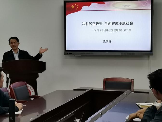 梁文锦同志带领大家学习了《习近平谈治国理政》第三卷中“决胜全面建成小康社会,决战脱贫攻坚”的内容,同时结合自身到英德市东华镇雅堂村进行精准扶贫的工作经历来进行讲述,分享了精准扶贫的成功经验:一是科学的思想理论;二是坚强的政治领导;三是显著的制度优势;四是强大的群众力量。