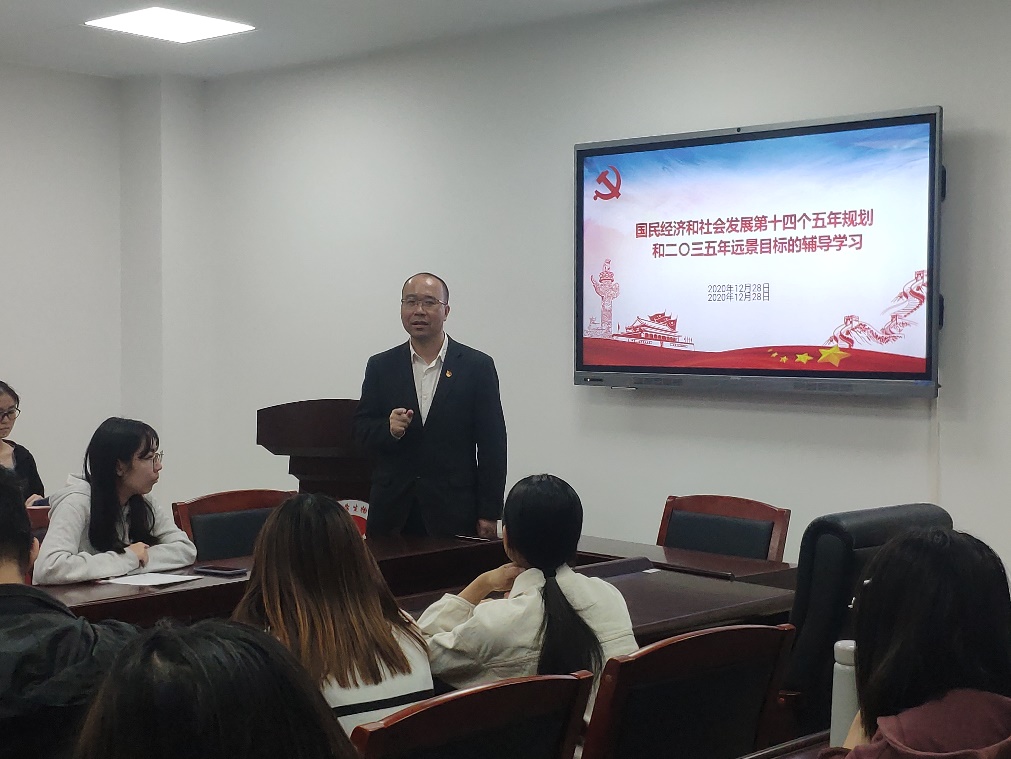 张智同志进行国民经济和社会发展第十四个五年规划和二〇三五年远景目标的辅导学习报告,回顾了我国“十三五”规划以来所取得的辉煌成就,并重点介绍了“十四五”规划中科技创新、产业发展、国内市场、深化改革、乡村振兴、区域发展、文化建设、绿色发展、对外开放、社会建设、安全发展、国防建设等重点领域的指导方针和主要目标,结合学院专业特色和实际情况,对党员同志们提出了学习和工作的要求。
