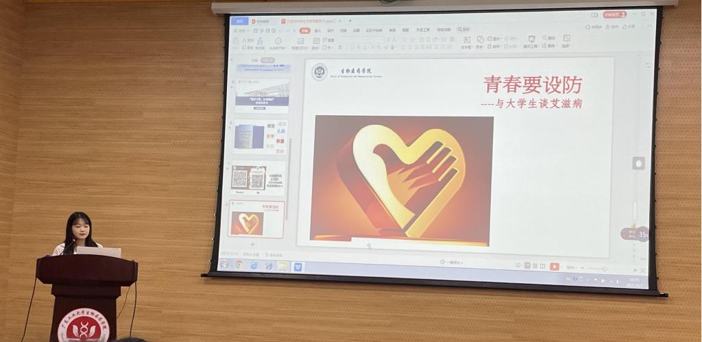 王绩滢以“青春要设防”为主题,从艾滋病的定义、疫情和预防等方面,利用现实案例及视频短片方式向大家宣传了艾滋病的相关知识。希望新生们树立好正确的恋爱观以及积极负责的人生态度,提高自我保护能力;学会守护青春,确保身心健康和生命质量。