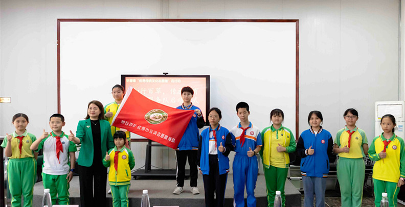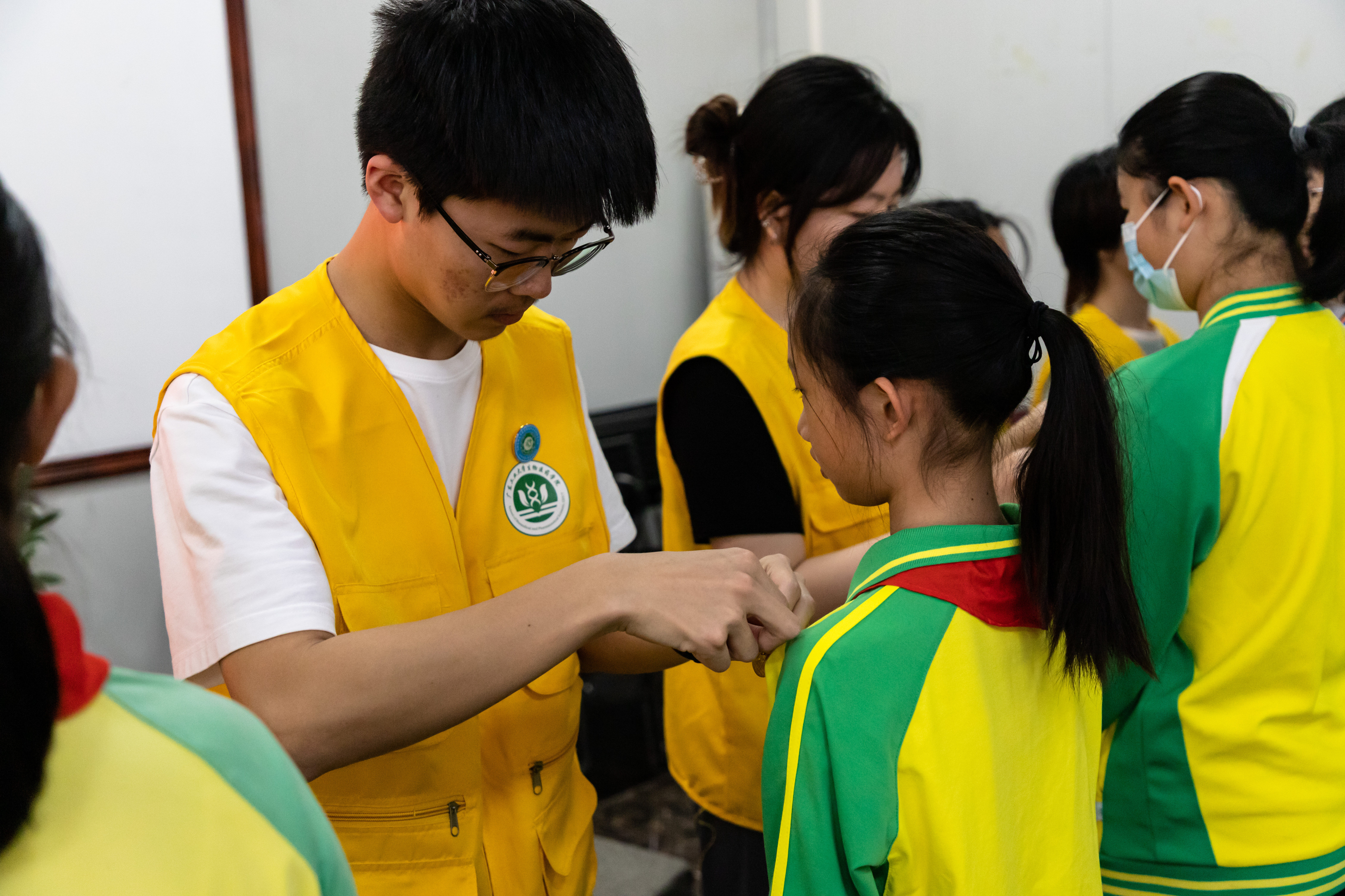 随后范丽旋为知行百草红领巾志愿服务队授旗,大学生宣讲员为少先队红领巾讲解员佩戴实践徽章。范丽旋表示共同成立知行百草志愿服务队和少先队志愿服务队有利于打通党员、团员、少先队员的一体化培养路径,更好地促进队员们的全方位发展。