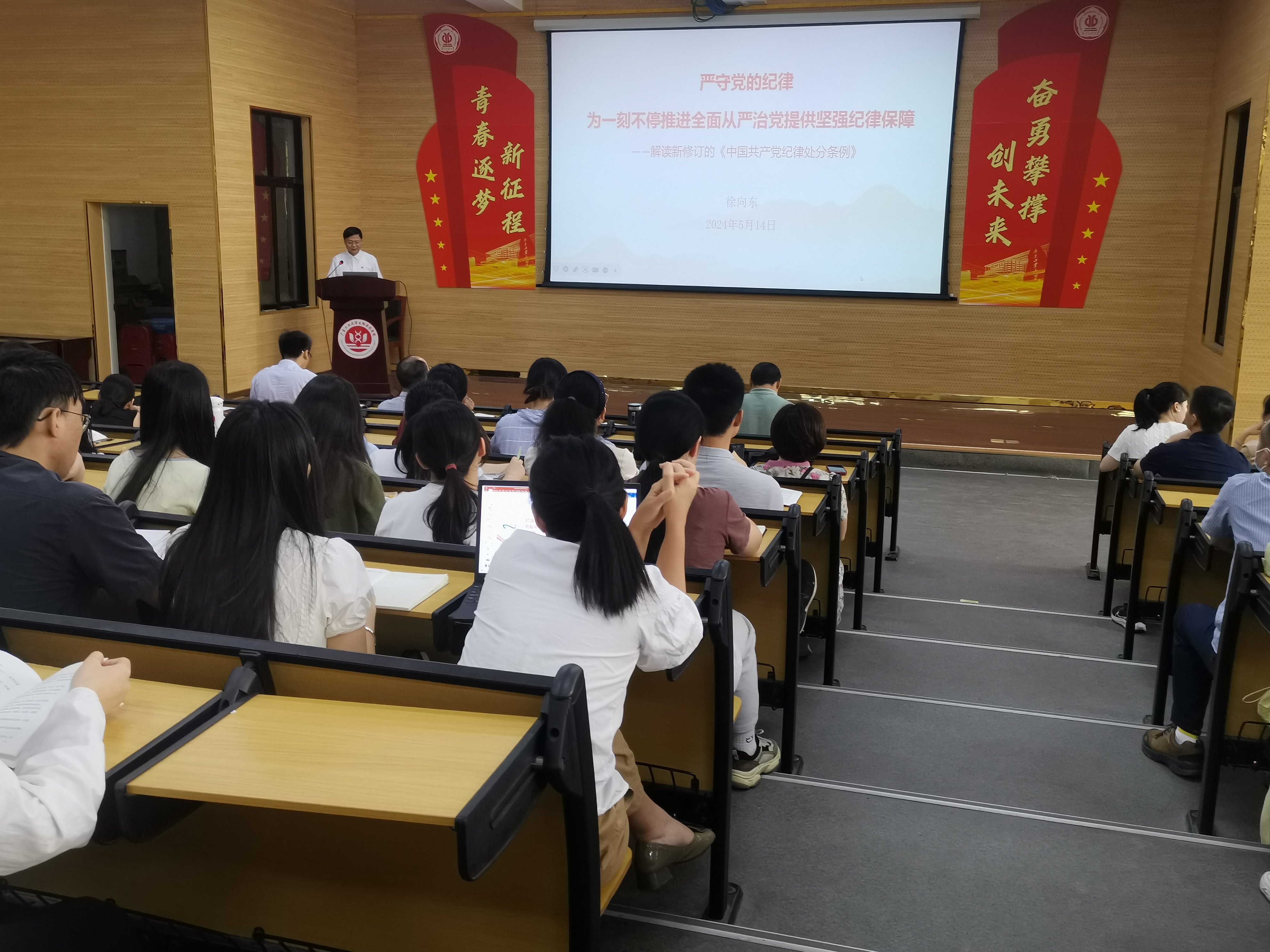 为加强党的纪律建设,推动党纪学习教育走深走实,5月14日下午在科技南楼一楼报告厅,学院党委书记徐向东为学院全体党员讲授了主题为《严守党的纪律,为一刻不停推进全面从严治党提供坚强纪律保障》的专题党课。会议由学院党委组织委员、副院长卢宇靖主持。