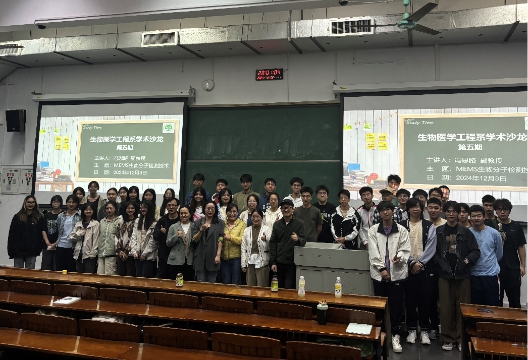 2024年12月2日晚上,第五期生物医学工程系学术沙龙在教3-101举行,本次学术沙龙邀请了我校集成电路学院的冯思路副教授作为主讲嘉宾,生物医学工程系教师、2022级和2023级生物医学工程专业“创新菁英培养计划”入选者及其他同学参加了本次活动。