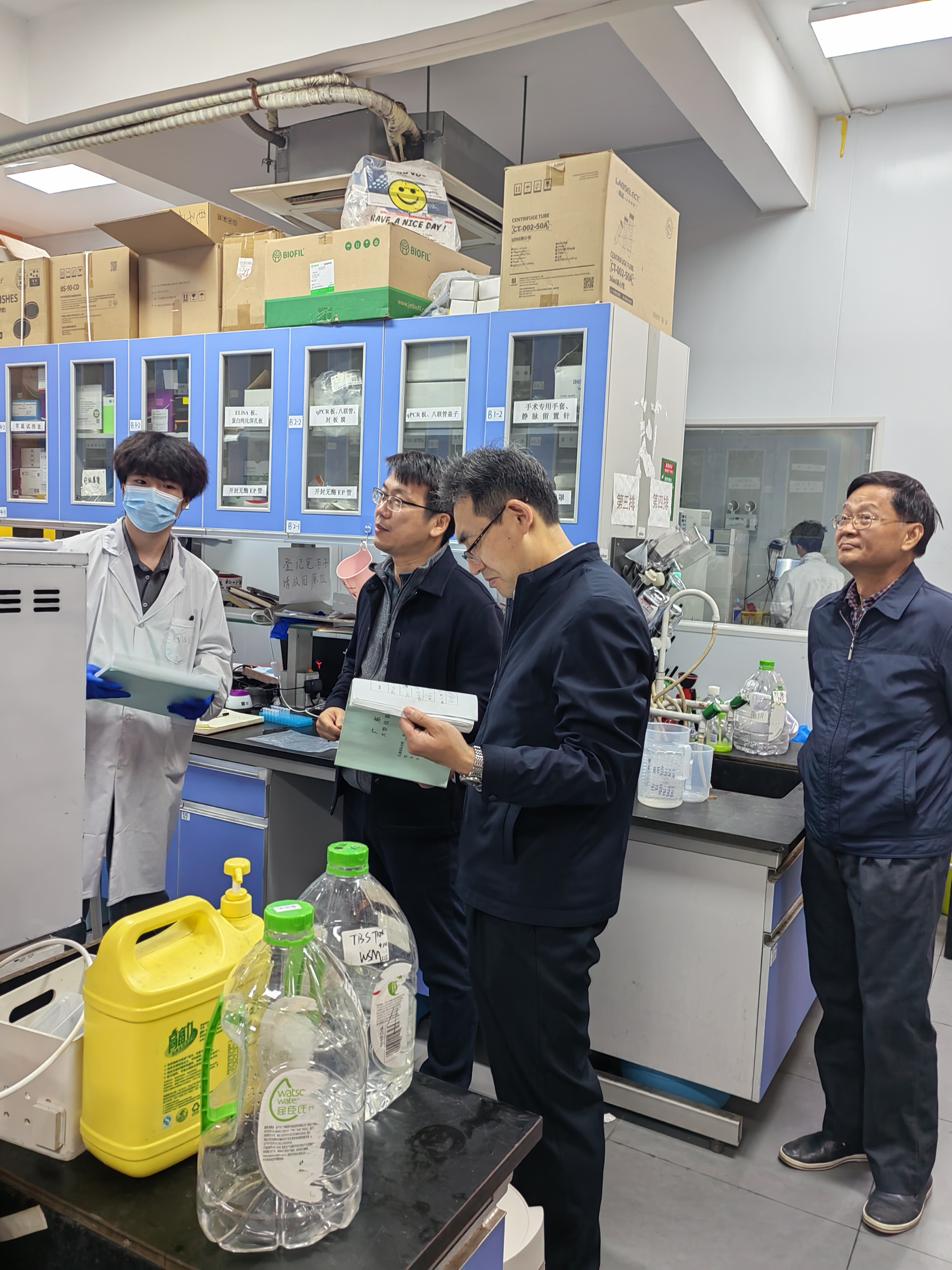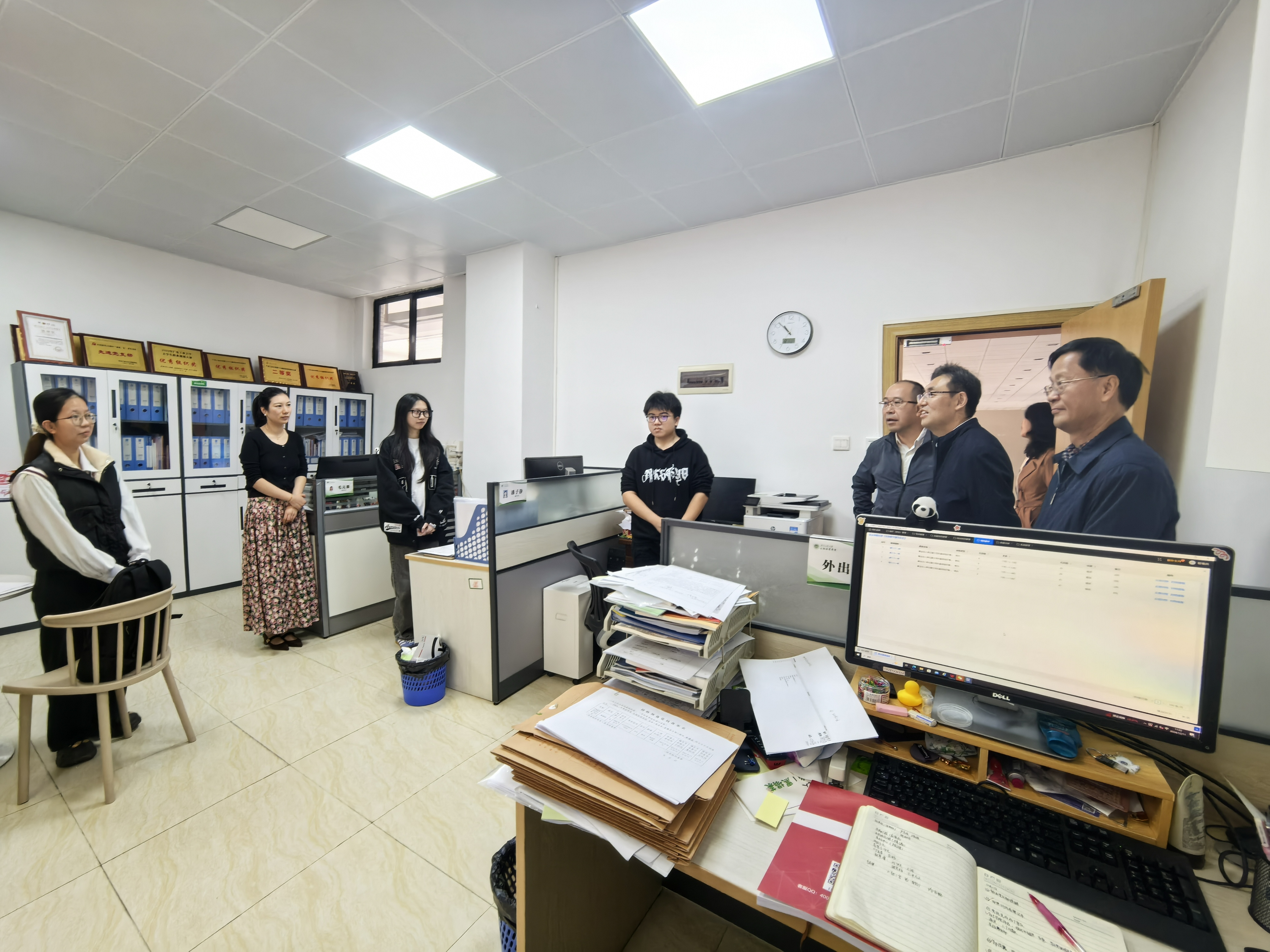 庞建国一行首先视察了学院公共测试平台、科研团队实验室,针对实验室使用及管理情况、实验室安全、仪器使用效率等多方面进行了现场检查。庞建国对学院近几年的工作给予了肯定,并强调:一、学院要不断提高大型仪器使用效率,仪器日常使用管理规范化,提高资产投入产出。二、学院应持续做好实验室安全管理工作,实验室危险品及风险源应做好台账登记,切实做到闭环管理。庞建国一行还来到学院学工办了解学生工作情况,询问了学生读研深造、创新创业、就业工作等基本情况,肯定了学院学生工作近两年取得的育人成效,并提醒学工队伍对重点关注学生的日常跟进和台账梳理,以“三全育人”的工作理念贯穿日常工作中。