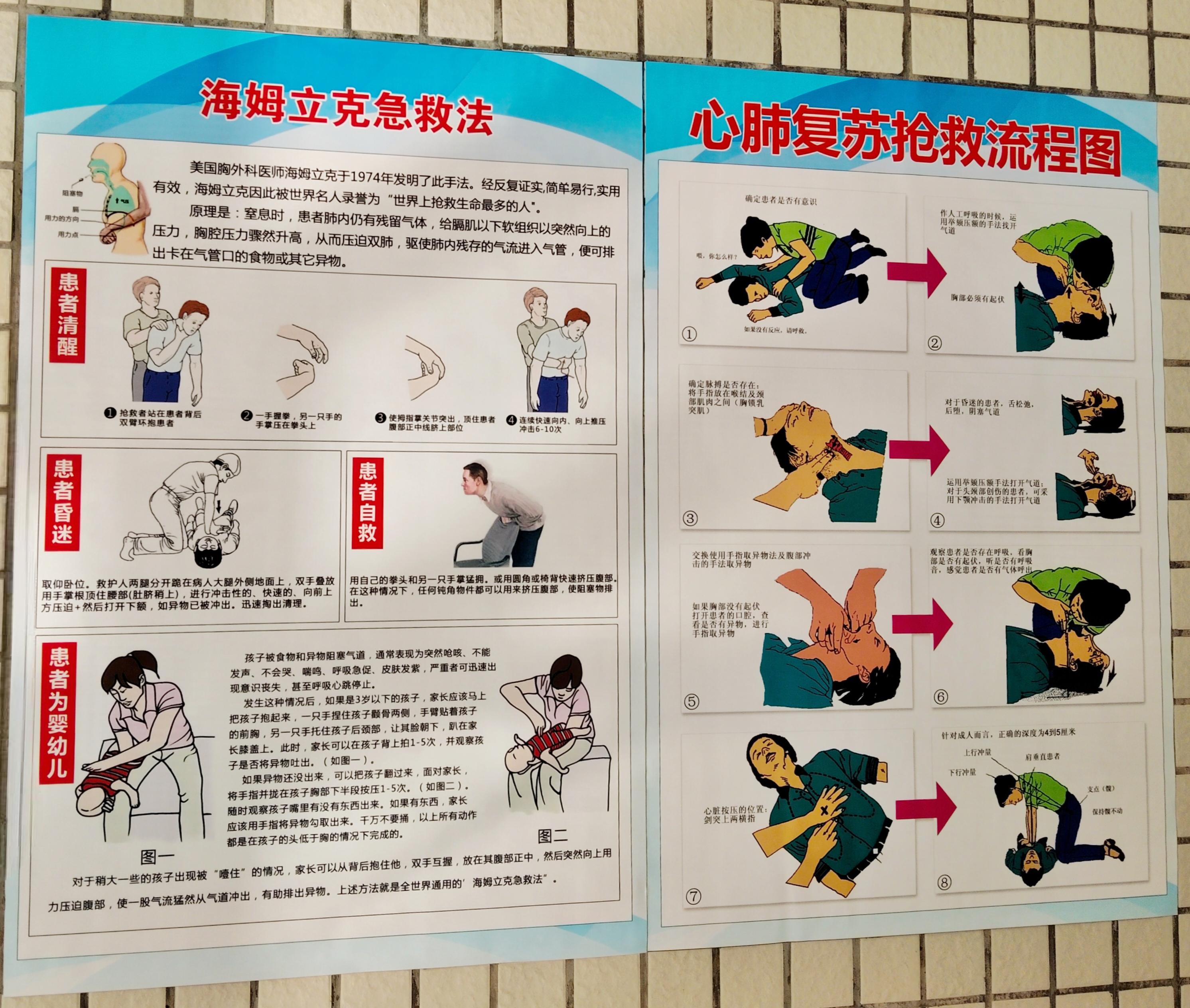 除了硬件设施的完善,学院还特别注重急救知识的普及。在安全药箱旁,一张张精心设计的海姆立克急救法、心肺复苏(CPR)图解赫然在目,通过直观易懂的图示步骤,引导师生学习并掌握关键的急救技能。这些知识的普及,不仅能够提升个人自救、互救能力,更能在关键时刻挽救生命。