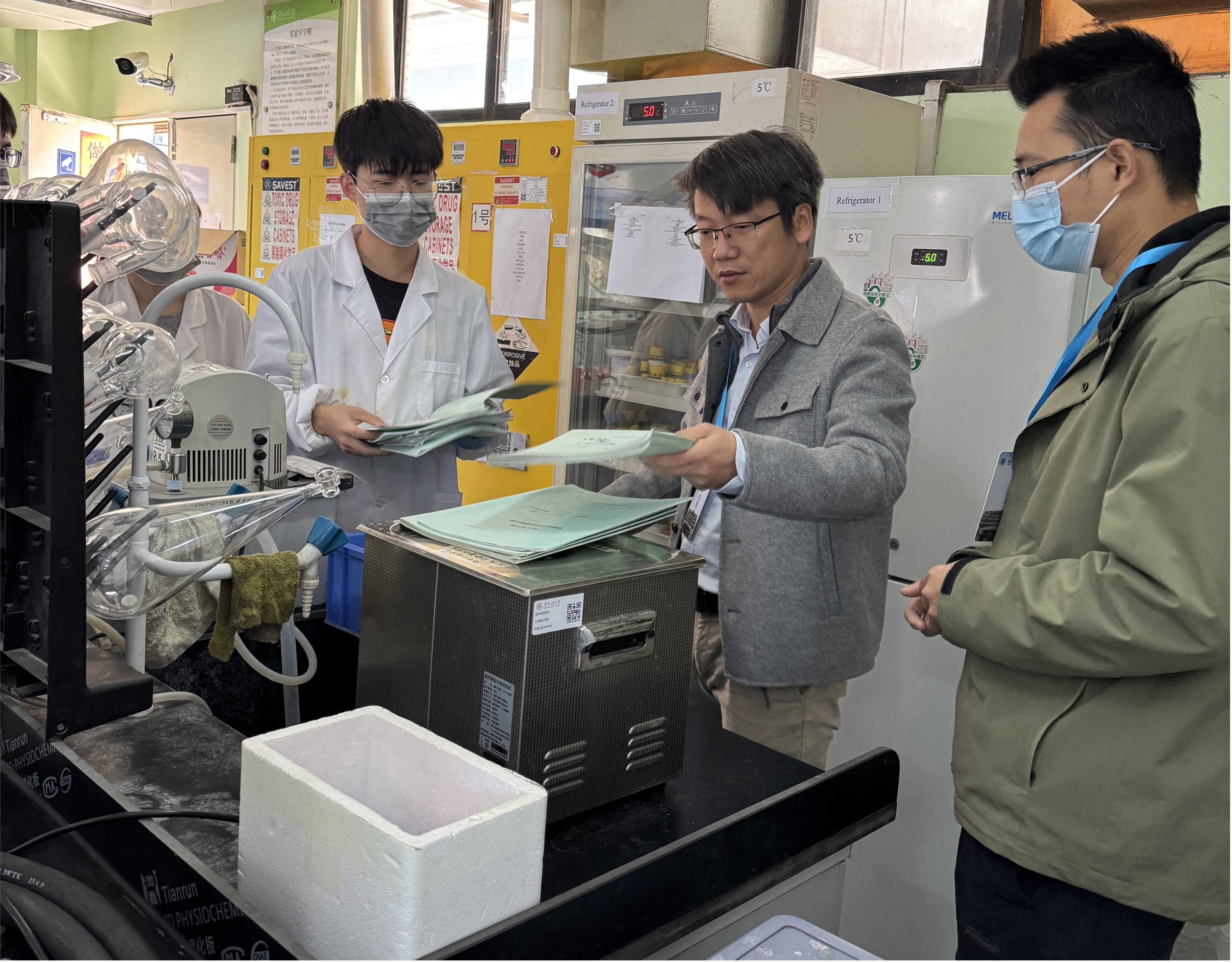 本次检查由学院副院长卢宇靖、实验中心主任陈修财带队,各科研团队/实验室教师代表、实验中心实验员积极参与,共同组成了一支专业且严谨的检查队伍。本次检查内容涵盖了危险源排查、消防安全检查以及化学品使用管理检查等多个方面,力求全面、细致、不留死角。