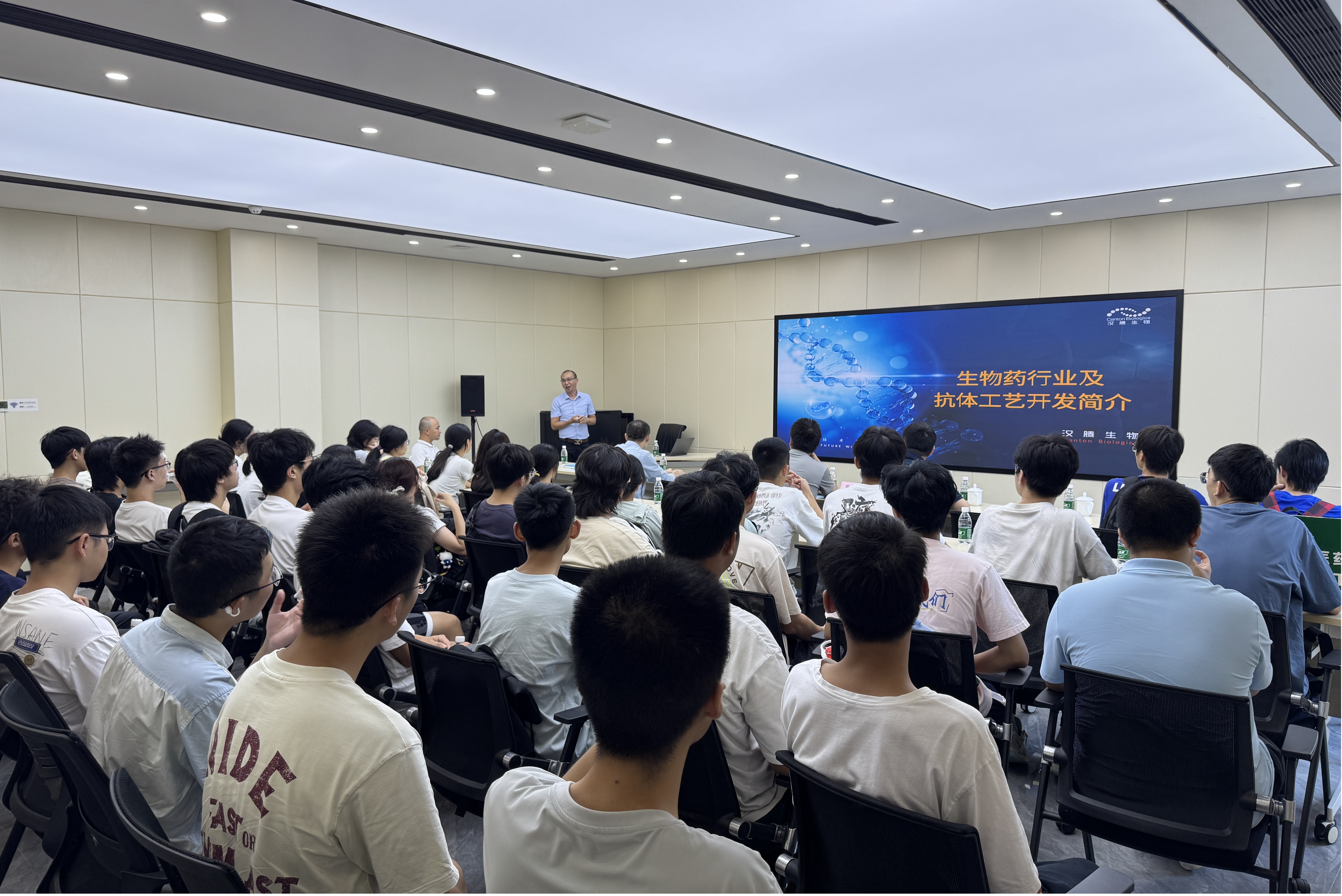 在广州高腾生物技术有限公司,公司负责人为同学们详细介绍了公司的基本情况、发展历程、主营业务与分析平台等。高腾生物韦庆焜总经理、李帮华副总经理、运营总监舒汨军老师就“生物药行业及抗体工艺开发简介”主题做了报告,并鼓励同学们在学习中注重基础知识、勤于思考和敢于创新,为未来在生物医药和健康领域做出独特贡献。生物工程专业学生通过本次参观学习,不仅加深了对本专业的理解,扩展了视野,对未来就业方向和企业对学生专业技能的需求有更好地了解,此次参观实践为学校的培养目标和方向提供了深刻启发和指引作用,同学们表示对于未来的学习方向和目标有了更清晰的认识。