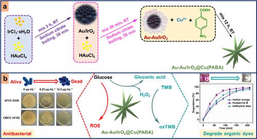 本论文制备了具有串联酶模拟活性(GOx-HRP)的Au-Au/IrO2@Cu(PABA)反应器。深入研究了该反应器的级联反应催化性能、稳定性、重复使用性以及在有机染料降解和抗菌方面的应用潜力。最终发现该反应器能通过其酶模拟活性产生包括HO·,1O2and O2-·在内的活性氧(ROS),能有效降解甲基橙,亚甲基蓝和若丹明B,并对金黄色葡萄球菌和大肠杆菌表现出优异的抗菌作用。