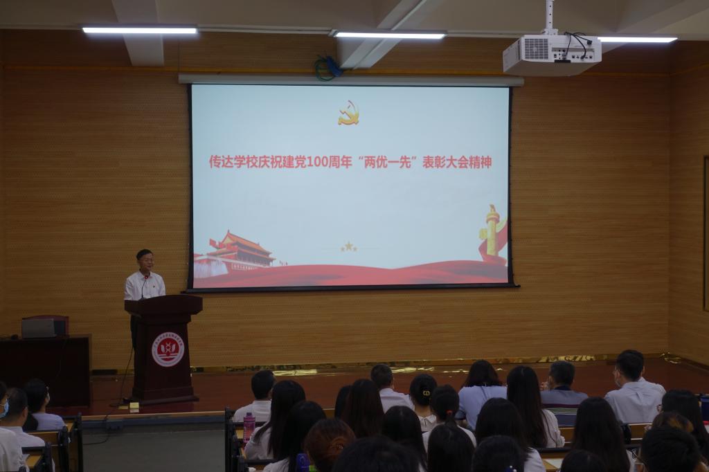 徐向东向全体党员传达了学校庆祝建党100周年“两优一先”表彰大会精神。(图/文:王智杰)