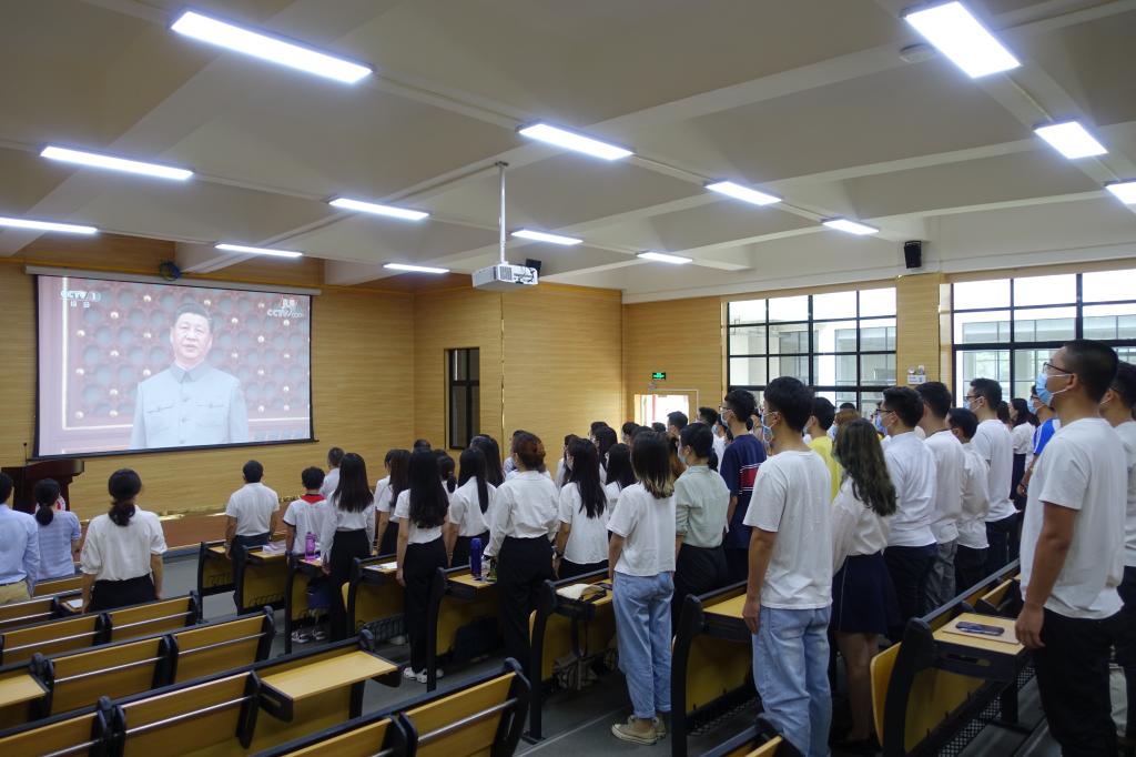 100响礼炮响彻云霄,致敬党的百年历程。国旗缓缓升起,全体师生党员肃立,唱中华人民共和国国歌。大会上,习近平总书记的重要讲话激荡人心、催人奋进,师生党员们聆听后纷纷表示,中国共产党的领导是中国蓬勃发展、领航向前的不竭动力,是领导中国特色社会主义事业的核心力量。大家将一如既往地紧密团结在以习近平同志为核心的党中央周围,牢记初心使命,坚定理想信念,践行党的宗旨,传承红色基因,继承和发扬党的光荣传统和优良作风,为中国特色社会主义建设事业,为实现中华民族伟大复兴的中国梦作出更大贡献。