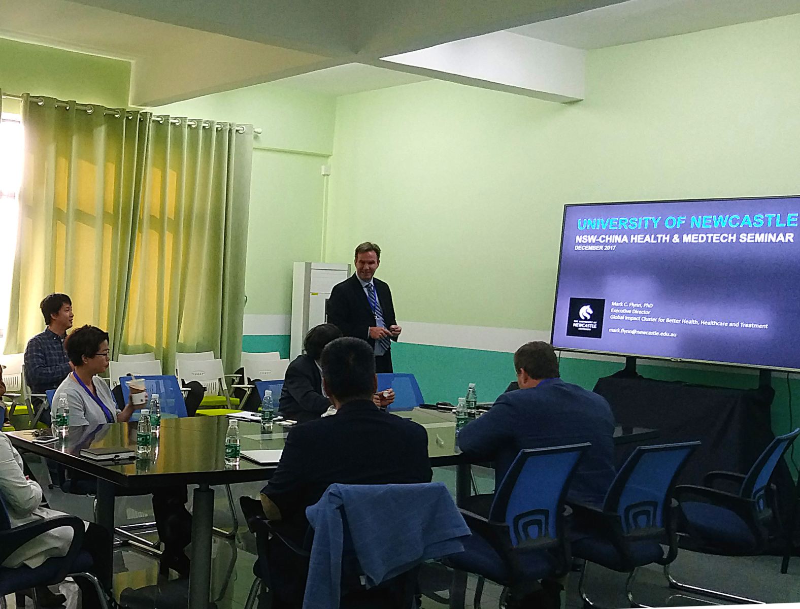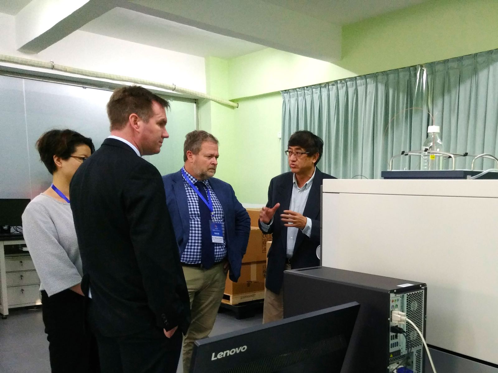 正值第26次广东省—新南威尔士州联合经济会议在广州举行之际,应生物医药研究院的邀请,来自澳大利亚新南威尔士州纽卡斯尔大学(The University of Newcastle Australia)的Michael Nilsson教授和Mark Flynn教授一行于2017年12月6日到看足球的网站 访问交流,佛山高新技术产业开发区管委会的相关代表也参加了此次的交流活动。 Nilsson教授和Flynn教授在谭文院长的陪同下,参观了看足球的网站 的科研平台,包括生命组学与精准医学平台、模式动物与转化医学平台等。Nilsson教授和Flynn教授详细听取了有关斑马鱼房、MALDI-TOF质谱成像系统、小动物超声成像仪、小动物CT成像仪等先进设备的讲解介绍,深入了解了如何基于MALDI-TOF检测关键因子空间分布的热度信息以及如何应用小动物CT成像仪检测体内白色脂肪和棕色脂肪等技术,赞不绝口,表示依托看足球的网站 的高端平台,今后双方能够就脑缺血的质谱成像及基于斑马鱼系统的疾病模型建立等课题开展更深层次的交流,实现双方共赢。期间,谭文院长向Nilsson教授和Flynn教授详细介绍了广东工业大学与佛山高新区利用“生物医药前孵化器”共建国际技术转移中心的意义与运作机制,两位教授均对此产学研创新结合的模式表现了浓厚的兴趣及好评,并对将来的合作和未来产业化发展提出了积极意见。